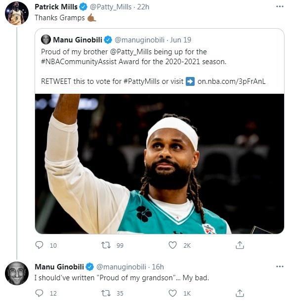 直播吧6月20日讯 马刺队球员米尔斯入选NBA本赛季社区关怀奖的最终候选人名单,马刺队名宿吉诺比利更新个人社交媒体,为米尔斯拉票。