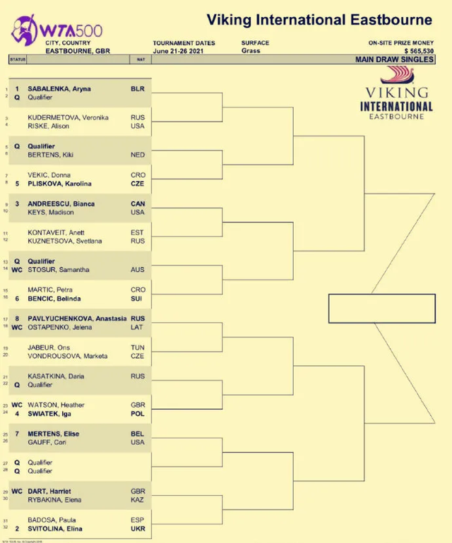 女子方面则有五位世界前十参赛,前四号种子是白俄罗斯名将萨巴伦卡、乌克兰小白菜斯维托丽娜、加拿大新星安德莱斯库和波兰新星斯瓦泰克。