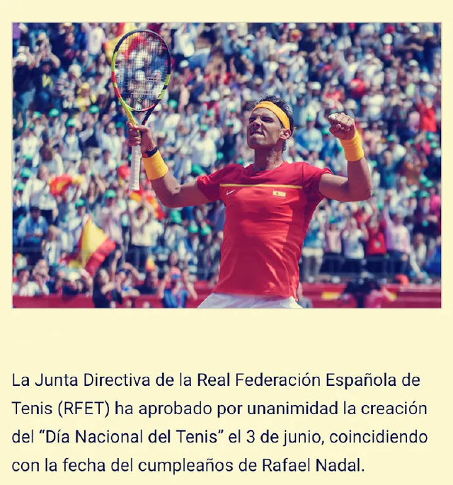 随后,西班牙国内网球迷对此话题展开热烈讨论,一致支持这一想法。而西班牙皇家网协也顺应民意,马上开会讨论,并得到董事会成员的一致同意。坐拥20个大满贯冠军的纳达尔是西班牙网球界乃至世界网坛的标志性人物,把他的生日定为“国家网球日”最合适不过啦!祝贺拉法!