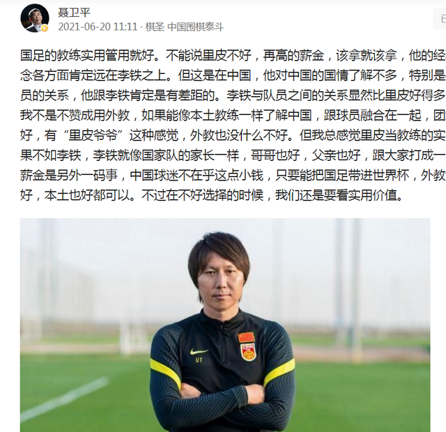 6月20日,自称“铁杆球迷”的“棋圣”聂卫平,再次对国足评头论足道: