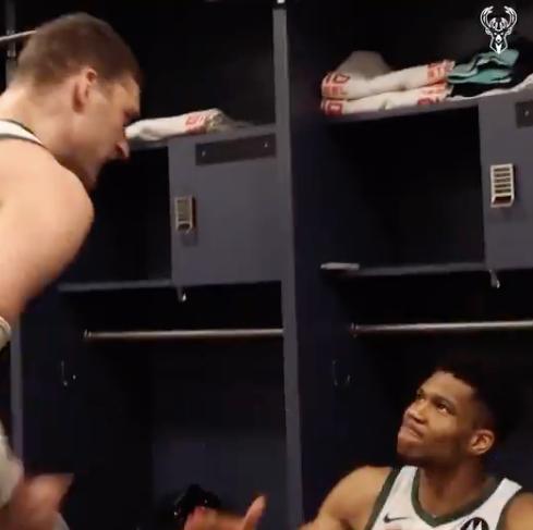 随后,洛佩兹走到了字母哥的面前,两人用力击掌,字母哥表情专注,他握拳发狠,相当热血。