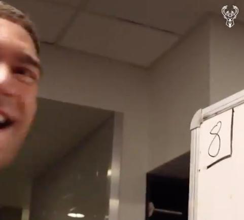 字母哥接受完采访最后一个走进了更衣室。走进更衣室的那一刻,字母哥跟队友和雄鹿工作人员击掌,脸上没有笑容,显得很淡定,异常平静。