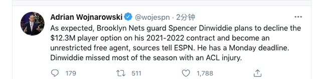 丁威迪的合同还剩下一年,价值1230万美元,但是,他拥有球员选项。如今,他选择放弃执行球员选项,试水自由球员市场,其实也在意料之中。