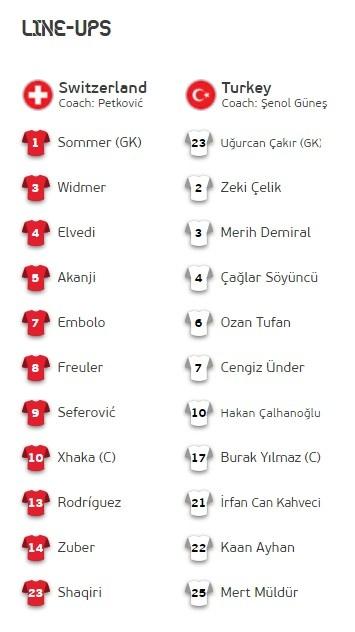 直播吧6月20日讯 北京时间6月21日00:00,欧洲杯A组第三轮,瑞士vs土耳其,赛前双方公布了首发名单。