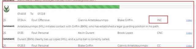 第二次漏判,是加时还剩1分34秒时,字母哥持球突破撞倒格里芬,这是一次进攻犯规,但裁判并没有吹,而字母哥在撞倒格里芬后将球传给身后跟进的大洛佩兹,后者上篮时被杜兰特摁下,裁判吹了争球,大洛佩兹跳赢拿到球权,随后格里芬领到第6次犯规离场,而字母哥接着在进攻中打进2分,将比分追平为111-111!