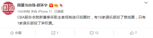 北京时间6月19日,根据国内媒体的爆料,CBA股东大会涉及到下个赛季的比赛进程方面,内部是组织一次投票,其中赛会制和主客场的投票方面,反对赛会制的高达95%,这就意味着恢复主客场的方案,恐是众望所归的决策。