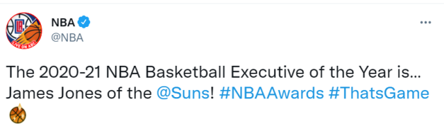 北京时间6月21日,NBA官方宣布,太阳总经理詹姆斯-琼斯当选年度最佳总经理。在去年休赛期,琼斯从雷霆换来保罗,又签下克劳德,太阳的战斗力得到明显提升。今年季后赛,他们连续淘汰湖人和掘金,杀入西部决赛。