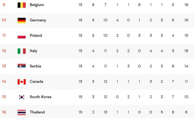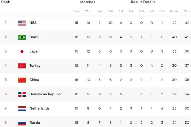 北京时间6月21日凌晨,世界女排联赛结束了常规赛最后一轮的争夺,中国女排3-0横扫美国队,在迎来7连胜的同时,送给对手首败,以10胜5负的战绩结束了本届世联赛之旅。日本女排3-0击败了塞尔维亚,俄罗斯则2-3爆冷输给了波兰,荷兰、德国、比利时也分别战胜了各自的对手,朱婷恩师古德蒂执教的土耳其女排,1-3不敌巴西女排。目前在积分榜上,美国14胜1负排名第一,巴西、日本、土耳其紧随其后,中国女排位列第五,泰国女排垫底。