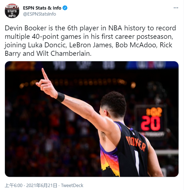 同时是布克季后赛第二次得到40+得分,这让他成为历史上第六位,在首次参加季后赛,就能多次交出单场40+的球员,成功比肩东契奇、詹姆斯、鲍勃-麦卡杜、里克-巴里和张伯伦。