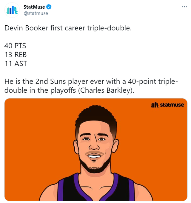 而在季后赛交出40+三双,也让布克成为太阳队史第二位,能够在季后赛交出40+三双的球员。