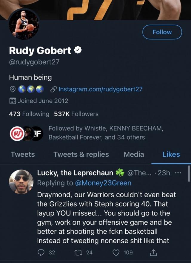 值得一提的是,这条推特,爵士球员戈贝尔点赞。