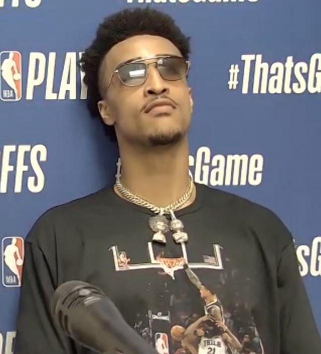 赛后科林斯来到发布会时,他的T恤相当抢眼,T恤的胸前印有本轮系列赛G6他高高跃起超筐隔扣恩比德的画面。