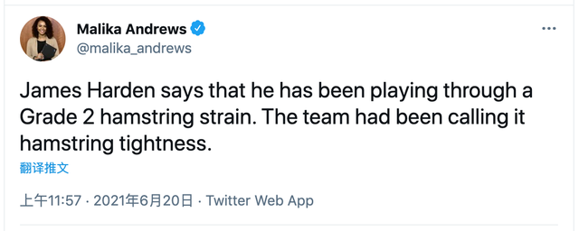 而在这场比赛之后,哈登也谈及自己的伤病问题,并且明确表示自己遭受的是2级腿筋拉伤: