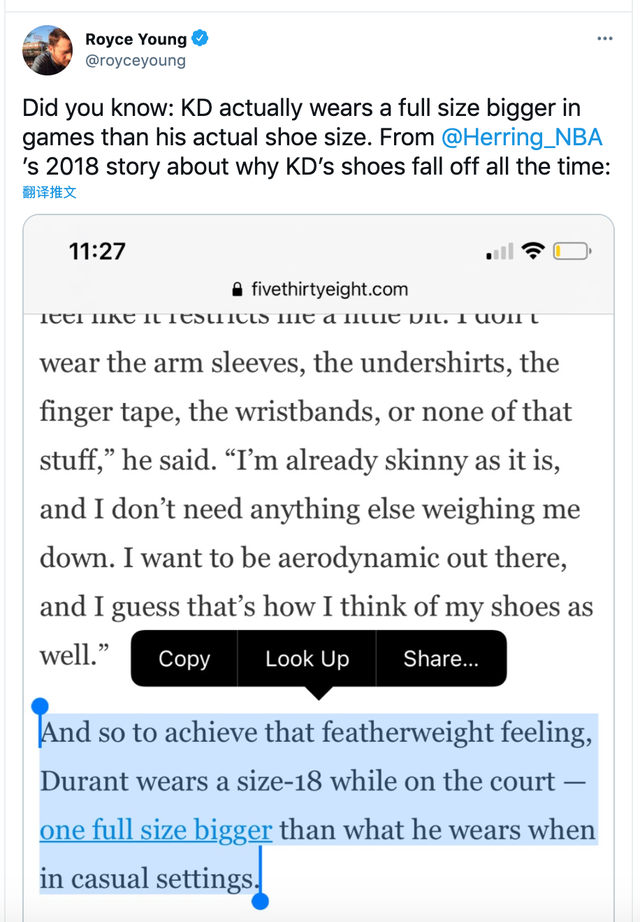 有美媒透露,实际上杜兰特在球场上更喜欢穿着大一号的球鞋,因为这会让在场上有更舒服的表现: