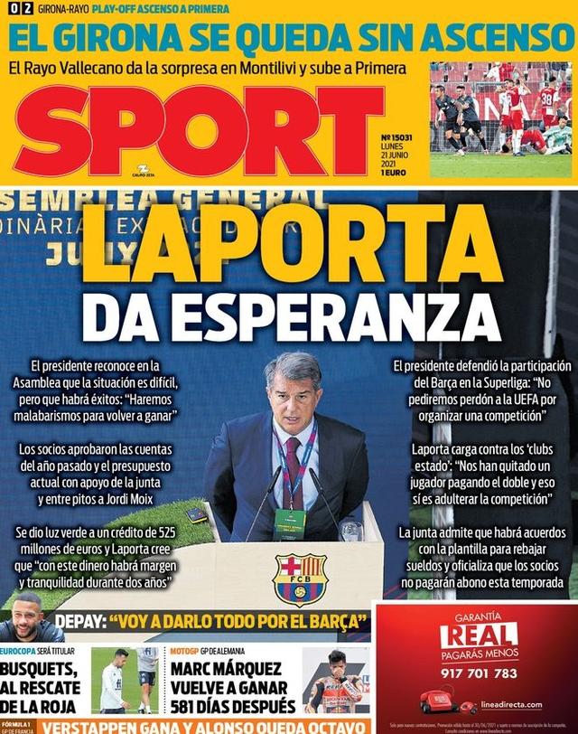 1、“拉波尔塔传递了信心”,拉波尔塔在巴萨俱乐部大会上发言:“我们会为了重新夺冠而努力,有了借贷的5.25亿欧元,未来两年我们都会很平静,我们不会为了组织一项赛事而向欧足联道歉。”