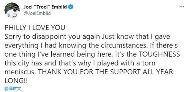 赛后,恩比德还更新了社媒,“费城我爱你!很抱歉再次让你失望,我知道我付出了我所拥有的一切。如果说我在这里学到了什么的话,那就是这座城市的坚韧,这就是为什么我半月板撕裂仍旧打比赛的原因,感谢您一年来的支持!!”
