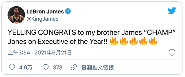 对此,作为湖人当家巨星布朗-詹姆斯也在社交媒体上祝贺了这名前冠军队友: