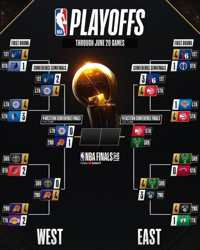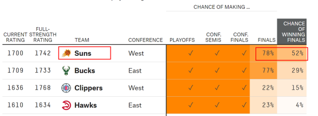 北京时间6月21日,太阳120-114主场击败快船,拿下西决首胜。布克40分13篮板11助攻,拿下生涯第一次三双。老鹰103-96击败费城,和雄鹿会师东部决赛。赛后数据网站FiveThirtyEight第一时间更新了夺冠概率。太阳成为最被看好的球队。