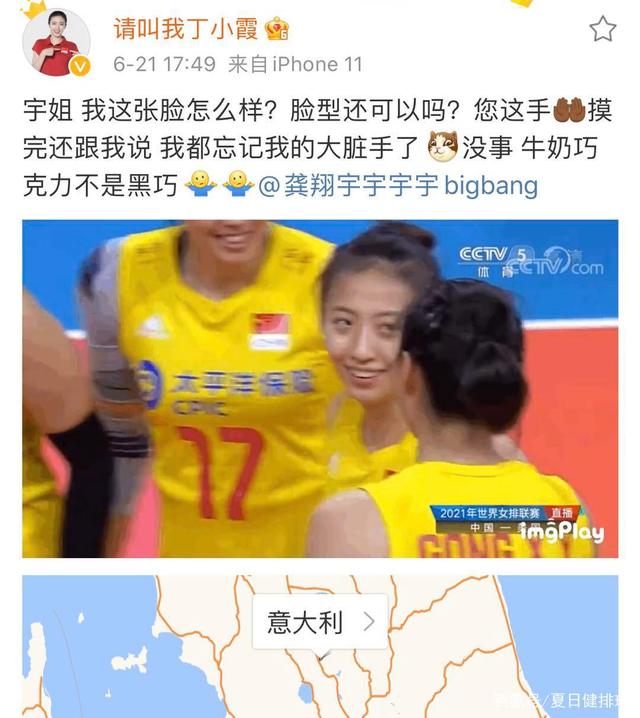 这是昨晚3-0美国女排的比赛时,小宇在接到丁霞背传后进攻拿下最后1分的一幕场景:和队友庆祝胜利时,龚翔宇给了丁霞一个”摸脸杀“。对此,丁霞发布动态假装生气地说:”宇姐,我这张脸怎么样?脸型还可以吗?您这手摸完还跟我说,我都忘记我的大脏手了”。小编觉得,丁小霞被摸脸也就算了,但是,被摸完后小宇宙还告诉自己是大脏手,这都被“欺负”到头顶了。随后,丁霞又对小宇宙调侃道:”没事,牛奶巧克力不是黑巧“,意思应该是小宇的手虽然脏,也算巧克力,至少不是黑色的。