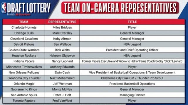 直播吧6月22日讯 明日,NBA将进行乐透抽签,今日官方公布了各队抽签代表,具体如下:
