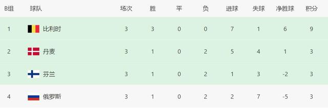 北京时间今天凌晨,欧洲杯B组和C组小组第3轮比赛战罢,其中丹麦4-1战胜俄罗斯,由赛前的0分变为3分,俄罗斯仍维持3分。而芬兰0-2不敌比利时,积分仍是3分。这样在B组中,比利时3战全胜,丹麦、俄罗斯、芬兰之间循环赢,同积3分,但因为丹麦队净胜球最多,排名小组第2名。