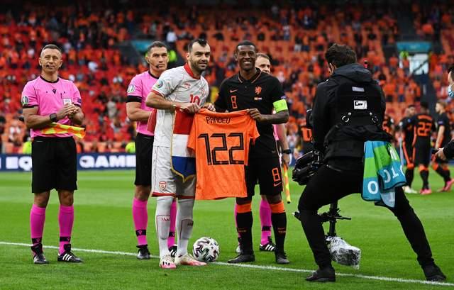 当然,在竞技之外,这场比赛还有两个催人泪下的时刻。比赛开始前,维纳尔杜姆将一件定制版荷兰国家队战袍送给了北马其顿队长潘德夫。37岁的潘德夫亲自确认,将在欧洲杯最后一轮小组赛之后正式从国家队退役。