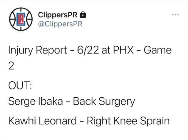 快船官方公布了伤情报告,其中莱昂纳德和伊巴卡都将缺席本场比赛。对于莱昂纳德伤情,主帅泰伦卢表示:“我真的不知道小卡的恢复情况,每天队医会跟我沟通他的情况,告知我他今天能不能打,然后我按照情况进行一天的工作。我不会去问他今天能不能打?他什么时候能回来?这些问题。”目前莱昂纳德仍在洛杉矶进行康复训练,他想要尽快回归帮助到球队,目前快船在西决0-1落后太阳。