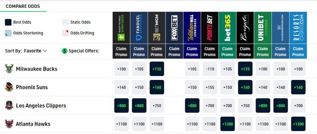 在这样的基础上,八大公司在6月21日就给出了夺冠赔率,雄鹿+100至+110排在第一;太阳+140至+160排在第二;快船+750至+800排在第三;老鹰+1100至+1200排在第四。