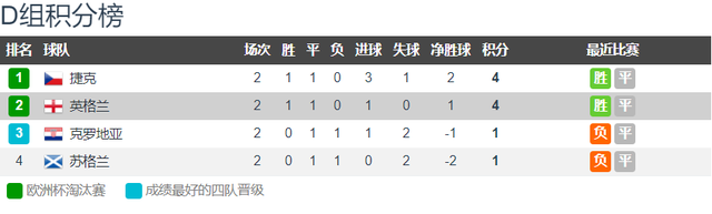 第一:两队均已晋级,争胜小组第一!欧洲杯D组两轮战罢,捷克和英格兰都是1胜1平积4分,其中捷克先是2-0击败苏格兰,再是1-1战平克罗地亚;英格兰先是1-0小胜克罗地亚,再是0-0战平苏格兰。由于B组第三芬兰和C组第三乌克兰都是积3分,因此捷克和英格兰已经提前1轮小组出线,两队可以说是毫无压力,此役对捷克和英格兰而言就是争小组第一。