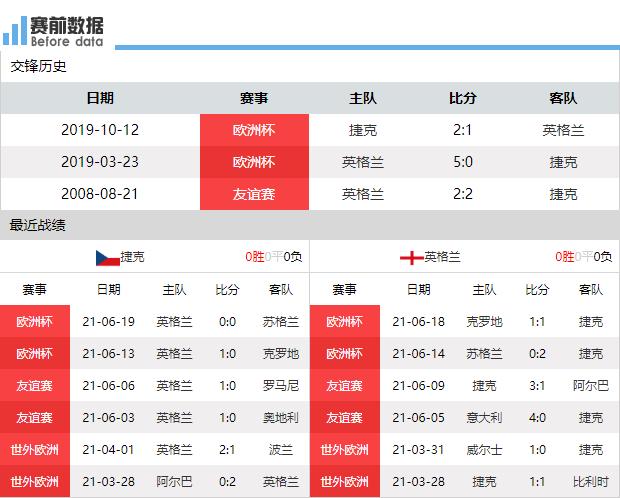双方近3次交手,1胜1平1负,难分伯仲。捷克各项赛事近6场比赛,2胜2平2负,整体战绩一般,但捷克是本届欧洲杯被低估的球队,具备扮演黑马的潜力;英格兰各项赛事近6场比赛,5胜1平,战绩彪悍,但本届欧洲杯英格兰进攻端哑火,2场比赛仅打入1球,索斯盖特的战术和临场换人是三狮军团最大的短板。