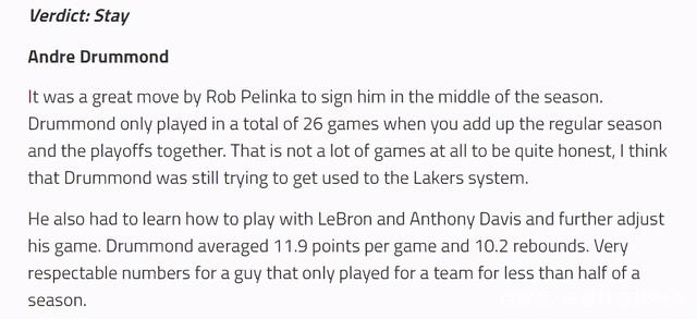 德拉蒙德上赛季在湖人水土不服,那么还要不要留他?美媒lakeshowlife认为湖人应该再给庄神机会,毕竟即便状态不佳,他仍然场均得到11.9分10.2篮板。如果给庄神足够多的时间,那么他和詹眉组合可以形成更好的化学反应。当然湖人留住庄神的前提是后者不能索要太大的合同,而湖人得清洗掉施罗德和库兹马,减轻薪金负担。