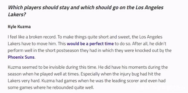 库兹马在季后赛的表现很令人失望,根本没有在进攻端给予詹姆斯和浓眉哥足够的支援。库兹马已经连续两年在季后赛发挥欠佳。不过,库兹马如果在别的非冲冠球队,也许场均得分能回升到20分左右。湖人可以用库兹马当筹码进行较补强。