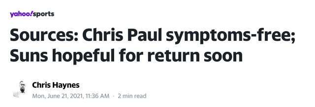 据雅虎体育记者克里斯-海恩斯的说法,太阳对保罗的进展感到明朗,太阳更是希望保罗能在西决系列赛前几场比赛内结束隔离阶段:
