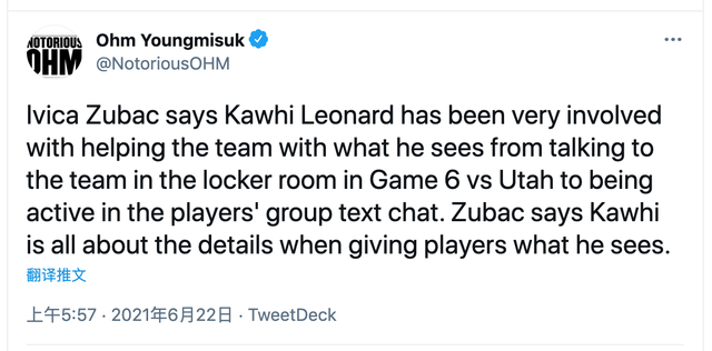“祖巴茨也透露,在对阵爵士系列赛第6场比赛时,伦纳德就在更衣室与球队和球员积极交流,伦纳德一直非常积极帮助球队解决他所看到的问题。”
