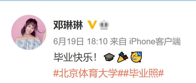 邓琳琳发布自己的毕业照片,毕业于北京体育大学,写道:“毕业快乐!”还有网友留言:“还是长发的琳琳好看。”邓琳琳回应道:“嘻嘻,我也是这么认为。”