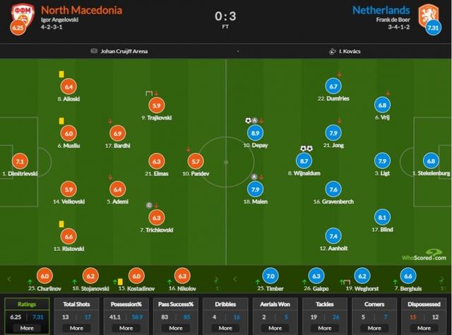 荷兰:斯特克伦博格6.8;德弗里6.8;德里赫特7.9;布林德8.1;邓弗里斯6.7;德容7.9;格拉文贝奇7.6;范安霍尔特7.4;维纳尔杜姆8.7;德佩8.9;马伦7.9;替补球员:廷博7.;加克波6.3;韦霍斯特6.2;博古伊斯6.6;
