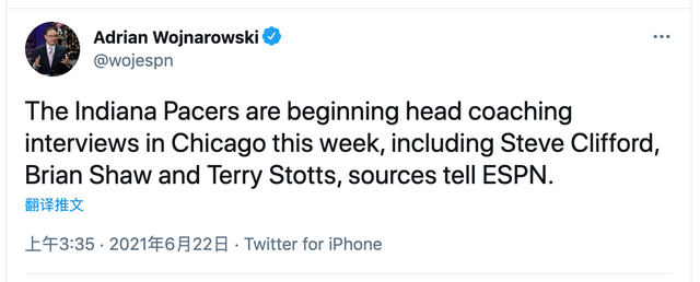 另一方面,据ESPN记者阿德里安-沃纳罗斯基的说法,步行者将会面试史蒂夫-克利福德,布莱恩-肖和特里-斯托茨等教练:
