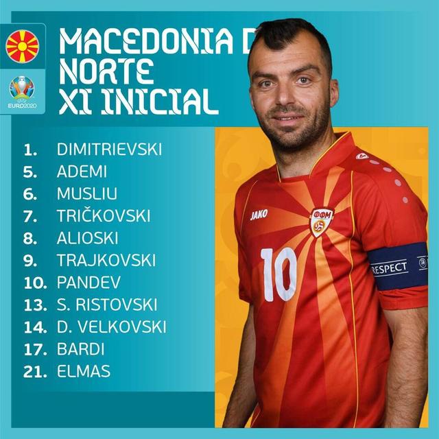 北马其顿首发:1-斯托尔-迪米特列夫斯基、6-维塞尔-穆斯利乌、8-阿里奥斯基、13-斯特凡-里斯托夫斯基、14-达尔科-维尔科夫斯基、5-阿里扬-阿德米、17-恩尼斯-巴尔迪、21-埃尔玛斯、7-特里茨科夫斯基、9-特拉科伊夫斯基、10-潘德夫