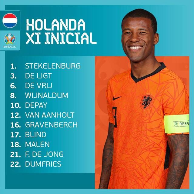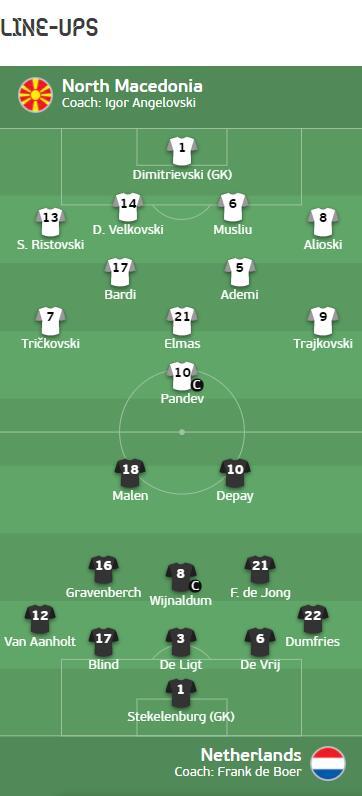 荷兰首发:1-斯特克伦博格、3-德里赫特、6-德弗里、12-范安霍尔特、17-布林德、22-邓弗里斯、8-维纳尔杜姆、16-格拉文贝奇、21-弗兰基-德容、10-德佩、18-马伦