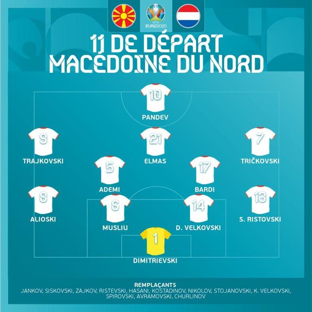 北马其顿替补:12-里斯托-杨科夫、22-达米扬-西斯科夫斯基、3-乔科-扎伊科夫、4-基尔-里斯特夫斯基、11-富尔汗-哈萨尼、15-提赫米尔-科斯塔迪诺夫、16-博班-尼克洛夫、18-斯托亚诺夫斯基、19-维尔科斯基、20-斯特凡-斯皮洛夫斯基、24-丹尼尔-阿维拉莫斯基、25-达科-科林诺夫