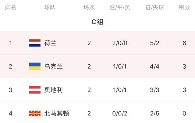 C组积分榜上,荷兰目前积6分已锁定小组第一出线,北马其顿则积0分已提前出局(同分情况先比胜负关系)。