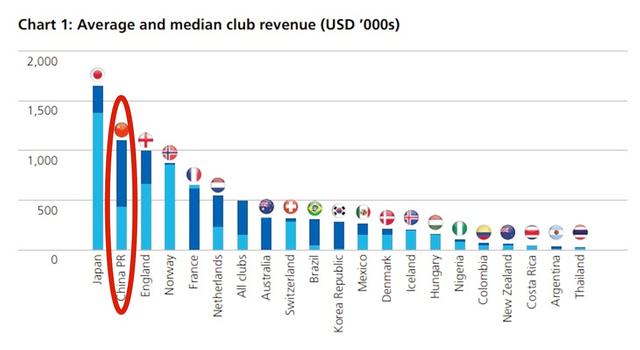 而在收入方面,中国女足俱乐部以110万美元,落后日本女足,排在全球第二位。