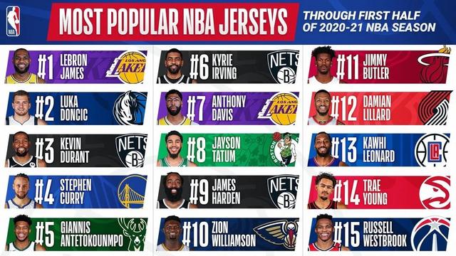 在本赛季的NBA球衣销量榜上,前10名依次为:詹姆斯、东契奇、杜兰特、库里、字母哥、欧文、戴维斯、塔图姆、哈登和蔡恩。其中,目前仍有希望冲击总冠军的只剩下字母哥。詹姆斯和戴维斯所在的湖人队在首轮被淘汰,库里的勇士队和蔡恩所在的鹈鹕队压根没有进入季后赛,杜兰特,哈登,欧文所在的篮网队在半决赛中被雄鹿队淘汰,塔图姆所在的凯尔特人队则在首轮出局。