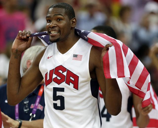 不过,杜兰特目前已经手握多项美国队历史第一的纪录。比如单届奥运会得分纪录(156分,2012年)、单届奥运会三分纪录(投中34个,2012年)、单届奥运会三分出手次数(65次,2012年)、场均得分纪录(19.4分)、三分命中总数(59个)5大纪录。