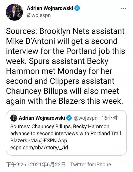 北京时间6月22日,根据ESPN名记WOJ报道,篮网助教德安东尼将在本周第二次面试开拓者主帅职位,而马刺助教贝基-哈蒙与快船助教比卢普斯已经完成第二次面试,因而开拓者新帅大概率会是在他们之间进行三选一抉择。