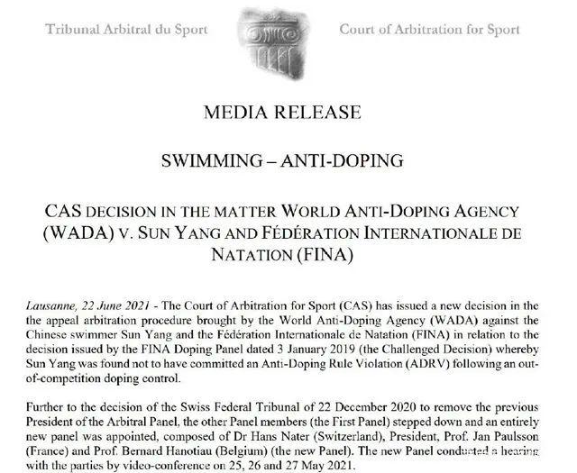 瑞士当地时间6月22日,国际体育仲裁法庭(以下简称CAS)宣布了对“世界反兴奋剂机构诉孙杨和国际泳联案”的重审结果:孙杨将被禁赛4年零3个月(51个月),自2020年2月28日算起。这意味着,对孙杨来说,已经被禁赛16个月了,大概还有35个月左右,也就是说,还有3年左右的时间。如今的孙杨,已经30岁了,三年之后33岁,在游泳这样的地盘上,可能大概没有他的什么事情了。