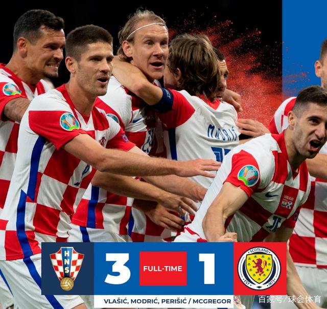 北京时间6月23日凌晨03:00,欧洲杯D组第3轮比赛,克罗地亚对战苏格兰,本场比赛上半场弗拉西奇破门,麦克格雷戈扳平。克罗地亚暂时1-1苏格兰,下半场,克罗地亚攻势依然不减,老将莫德里奇破门,佩里西奇建功,最终克罗地亚3-1击败苏格兰。