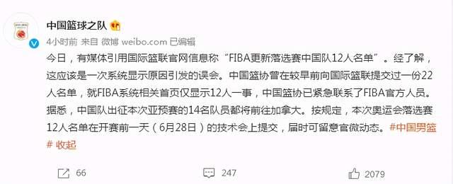 就在球迷在热议时,中国篮协也发现了这个问题,然后紧急发文辟谣,称这是国际篮联的一次系统错误,表示前往加拿大的队员依旧是14人,至于参赛的12人大名单,还是和亚预赛一样,在开赛前一天提交公布。