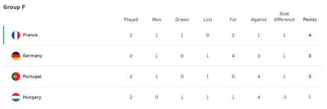 F组的形势比较复杂,法国队已经出线。末轮德国VS匈牙利,葡萄牙VS法国。德国只要拿1分就能出线,葡萄牙也需要在法国队身上拿1分。假设德国对阵匈牙利不败,葡萄牙只要不输给法国队3球以上也能以小组第3出线,因为目前在小组第3的排名上,葡萄牙净胜球为+1,而第5的芬兰为-2。