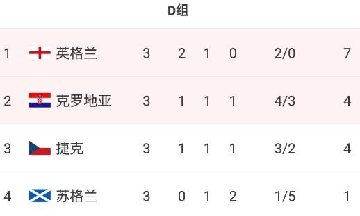 克罗地亚3-1苏格兰,凭借进球数多的优势升至第二,1/8决赛将对阵E组(瑞典、斯洛伐克、西班牙、波兰)第二。